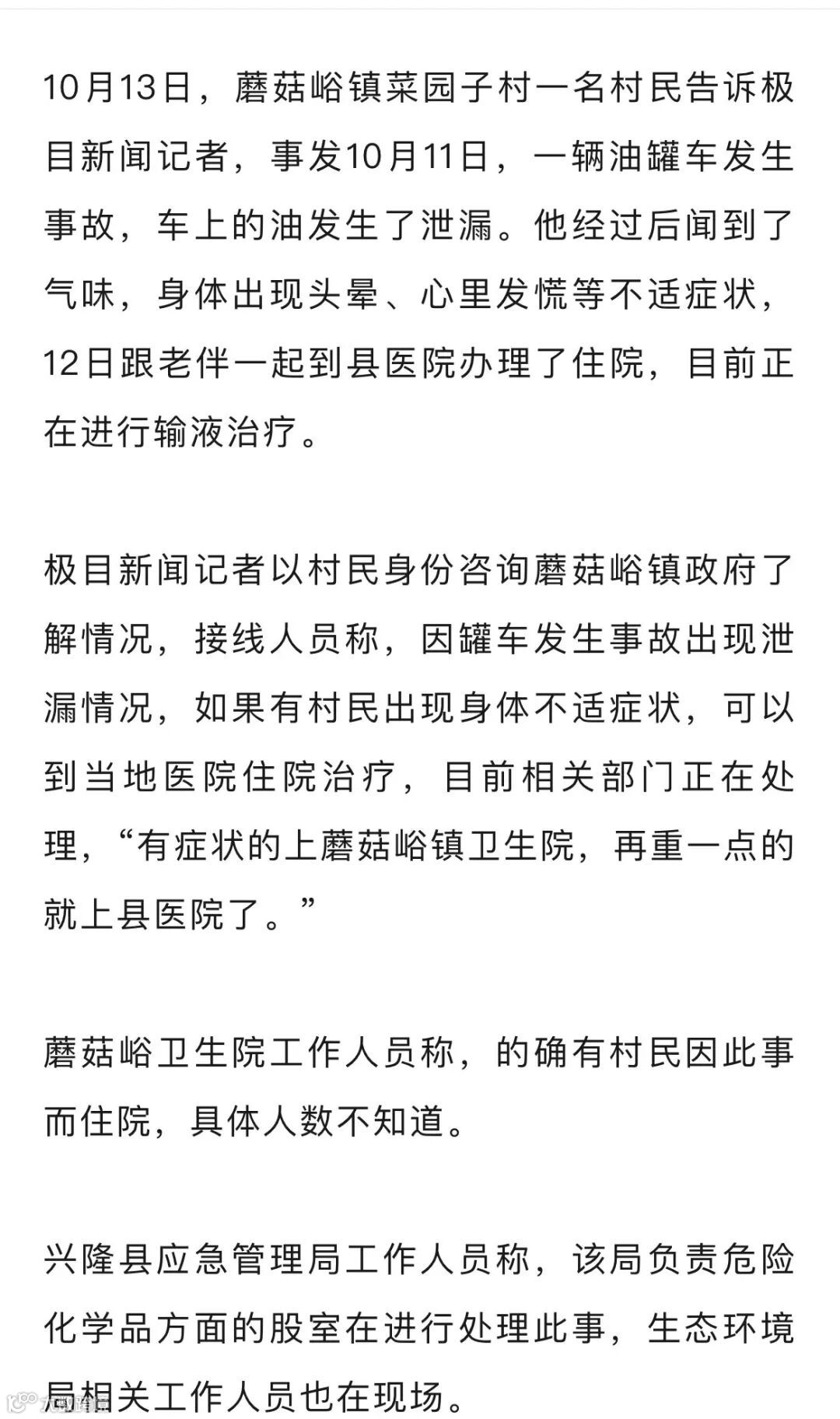兴隆县有关部门工作人员告诉极目新闻记者,事发11日凌晨5时许,一辆运送危化品石脑油的罐车发生事故。事发后,县政府、生态环境局等有关部门均在现场驻守,开展清理处置工作,后续会对环境空气和水质进行检测,并对外公布检测结果。