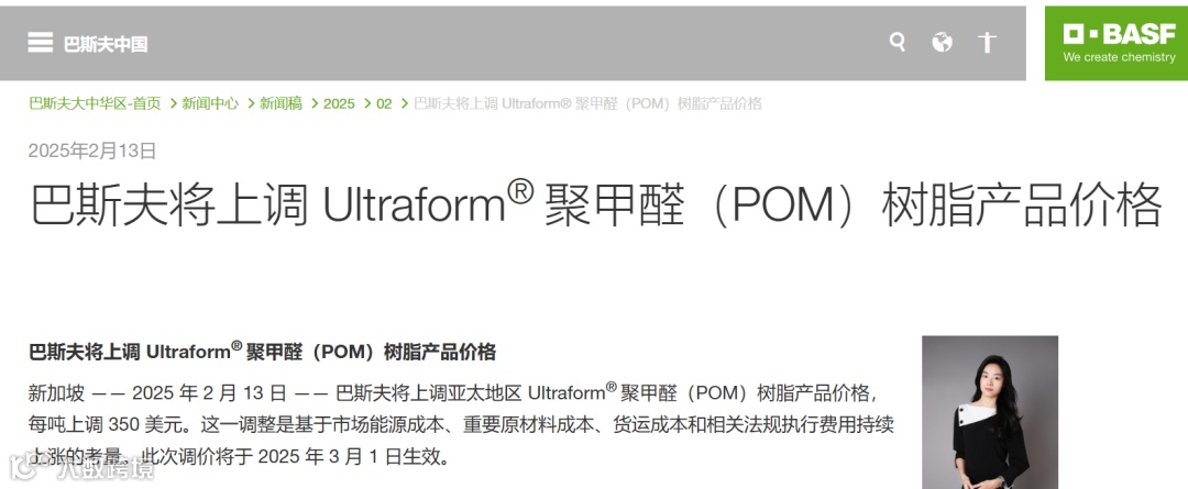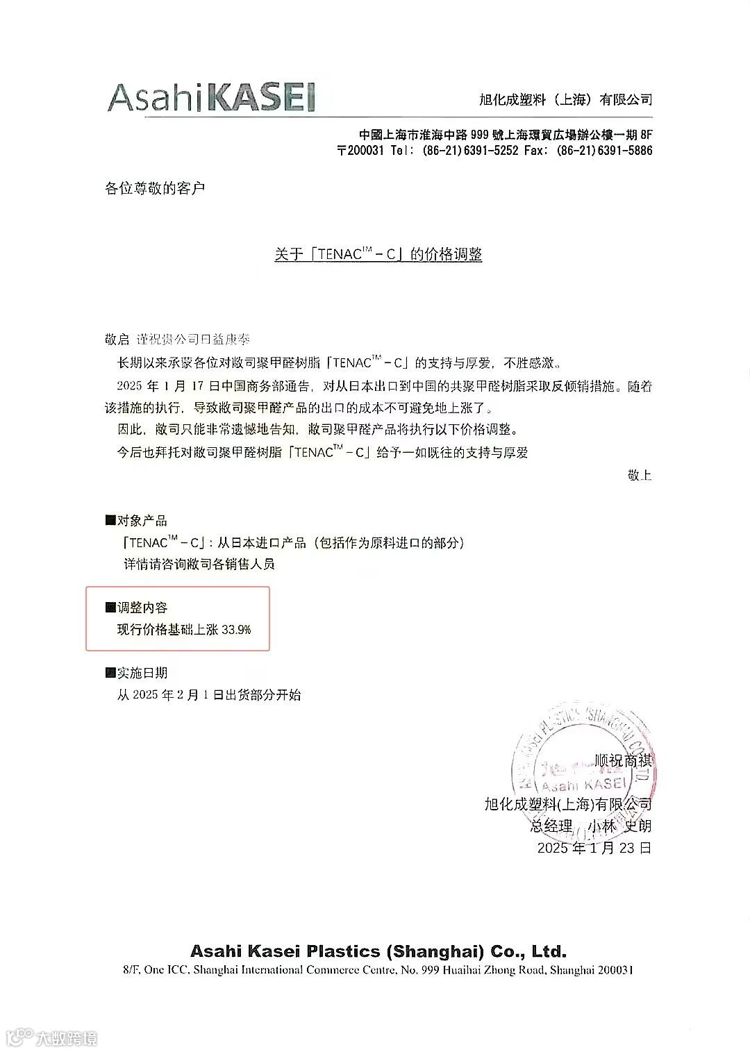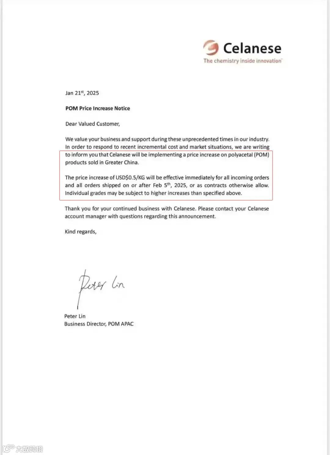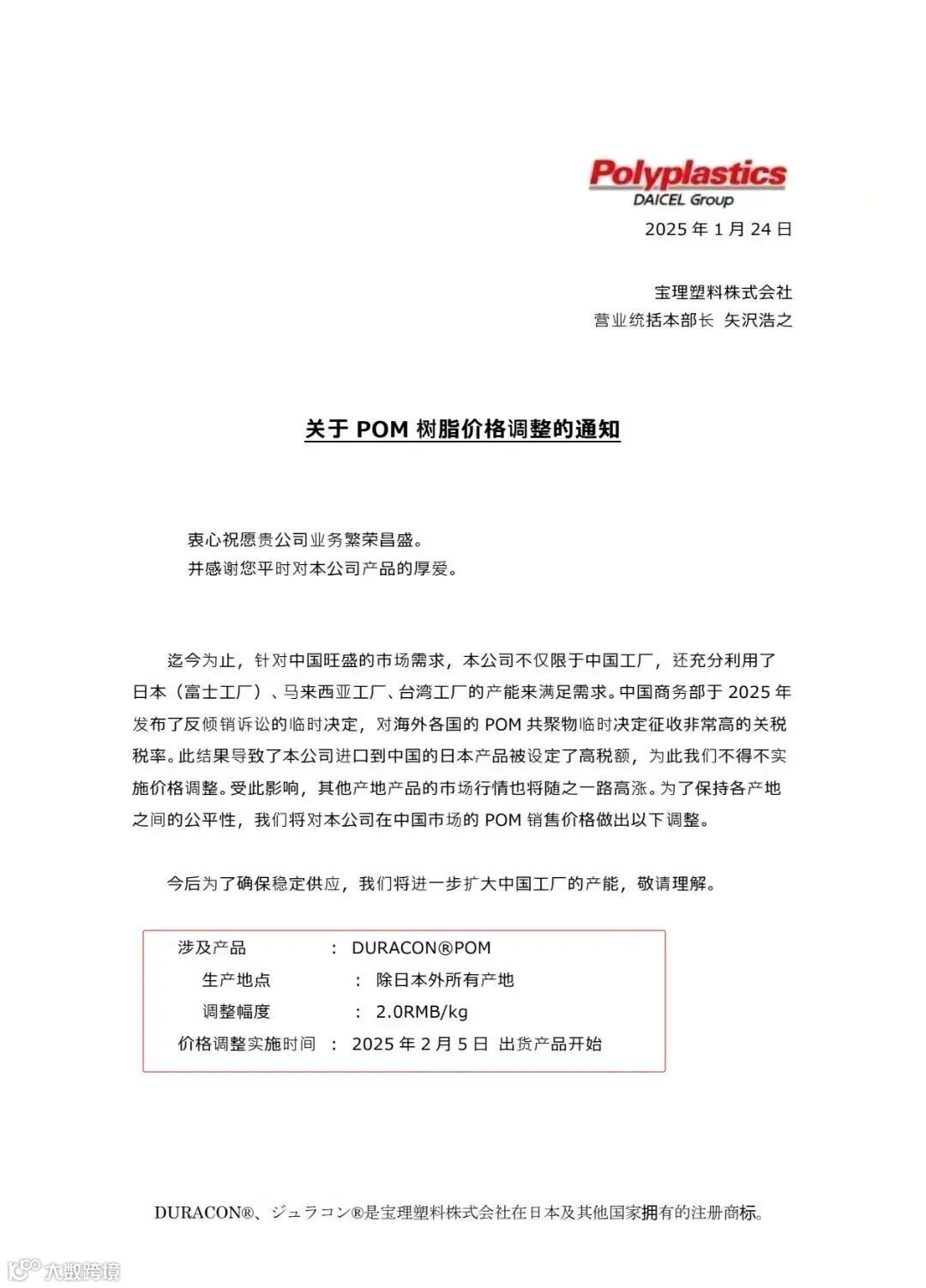 塞拉尼斯、宝理塑料、旭化成POM涨价函。
