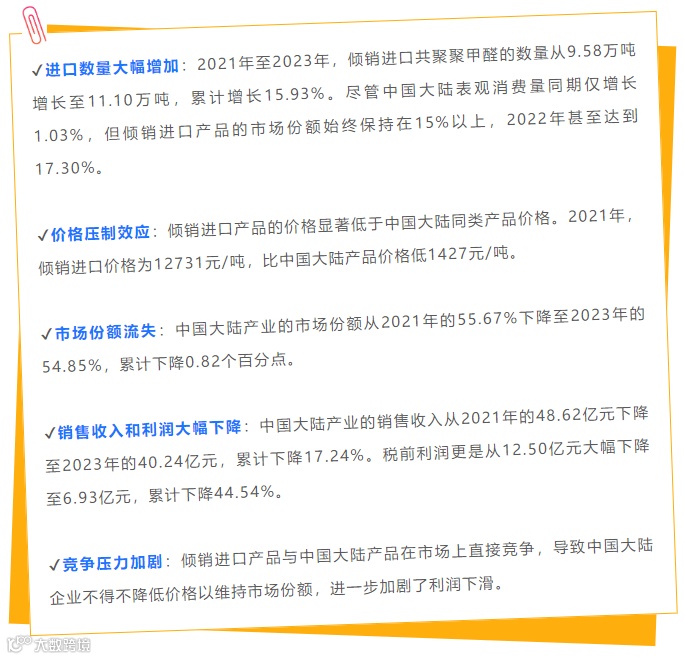 根据商务部长达102页的本次反倾销调查报告梳理发现,进口倾销POM对国内POM产业的冲击主要体现在进口数量大幅增长、价格压制效应、市场份额流失、销售收入和利润大幅下降等。