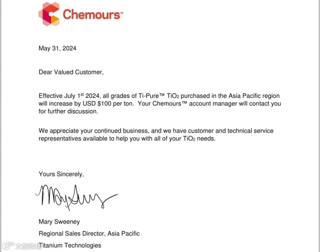 科慕:7月1日起,在亚太地区购买所有等级的Ti-Pure™钛白粉每吨将增加100美元。