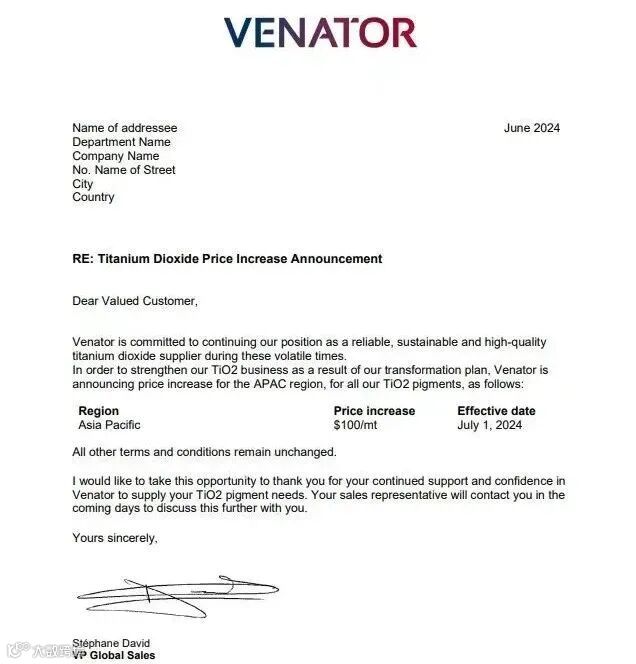 泛能拓Venator:7月1日起,亚太地区TiO2涨价100美元/吨。