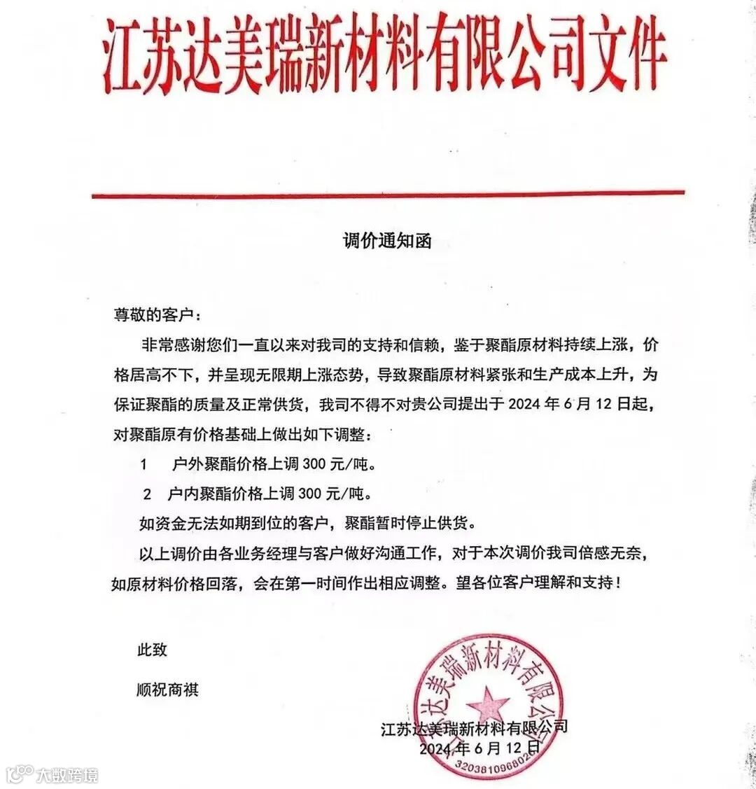 江苏达美瑞新材料:6月12日起,户外聚酯价格上调300元/吨,户内聚酯价格上调300元/吨。如资金无法如期到位的客户,聚酯暂时停止供货。