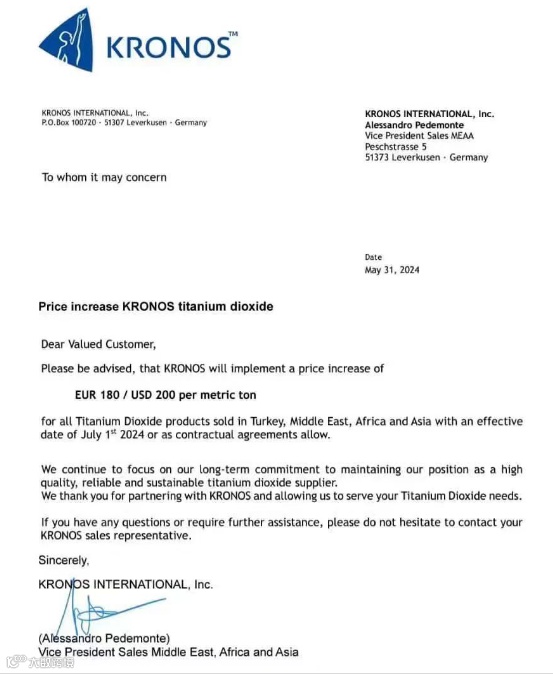 康诺斯:7月1日起,钛白粉每吨上涨180欧元/200美元,适用于在土耳其、中东、非洲和亚洲销售的所有钛白粉产品。