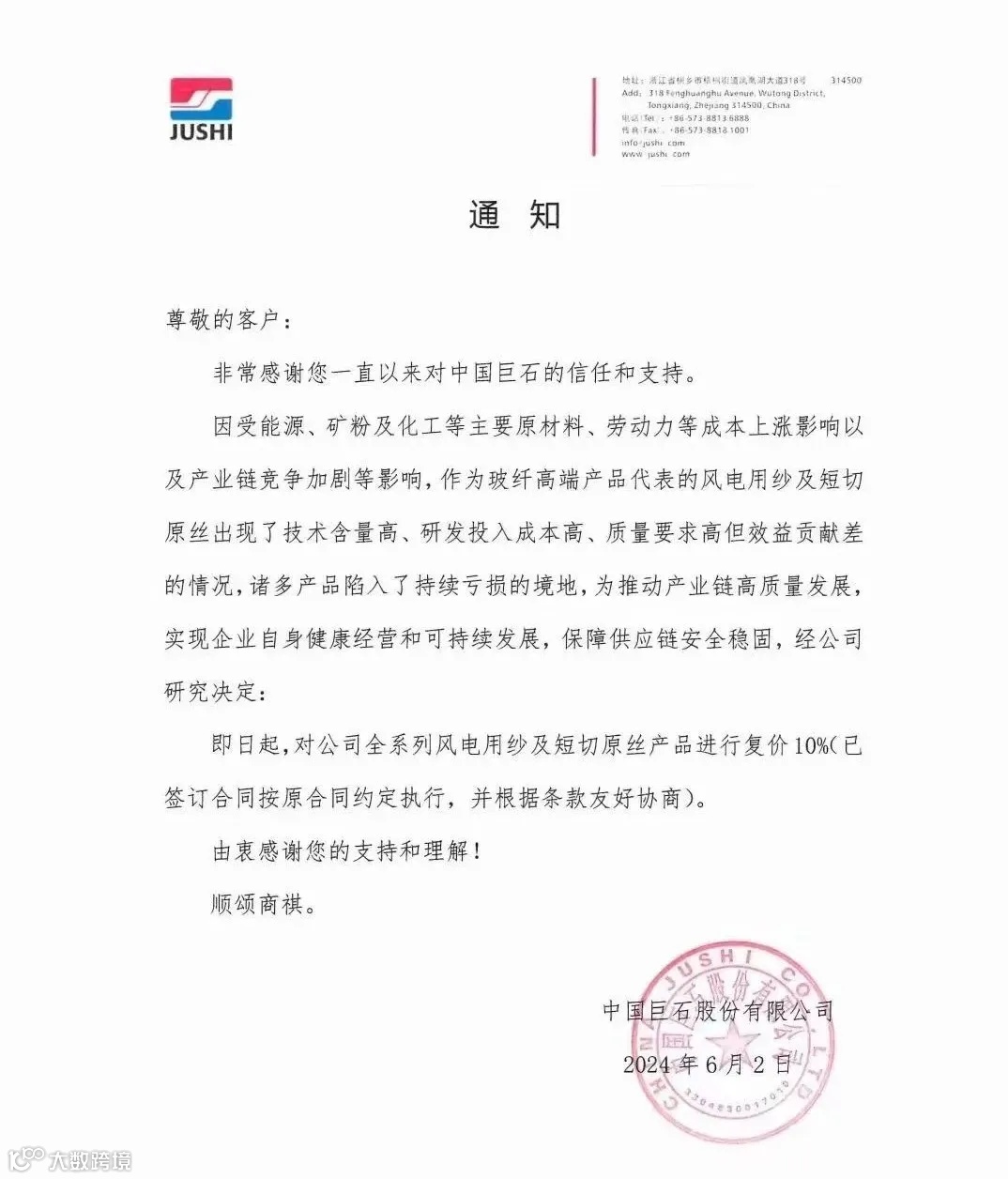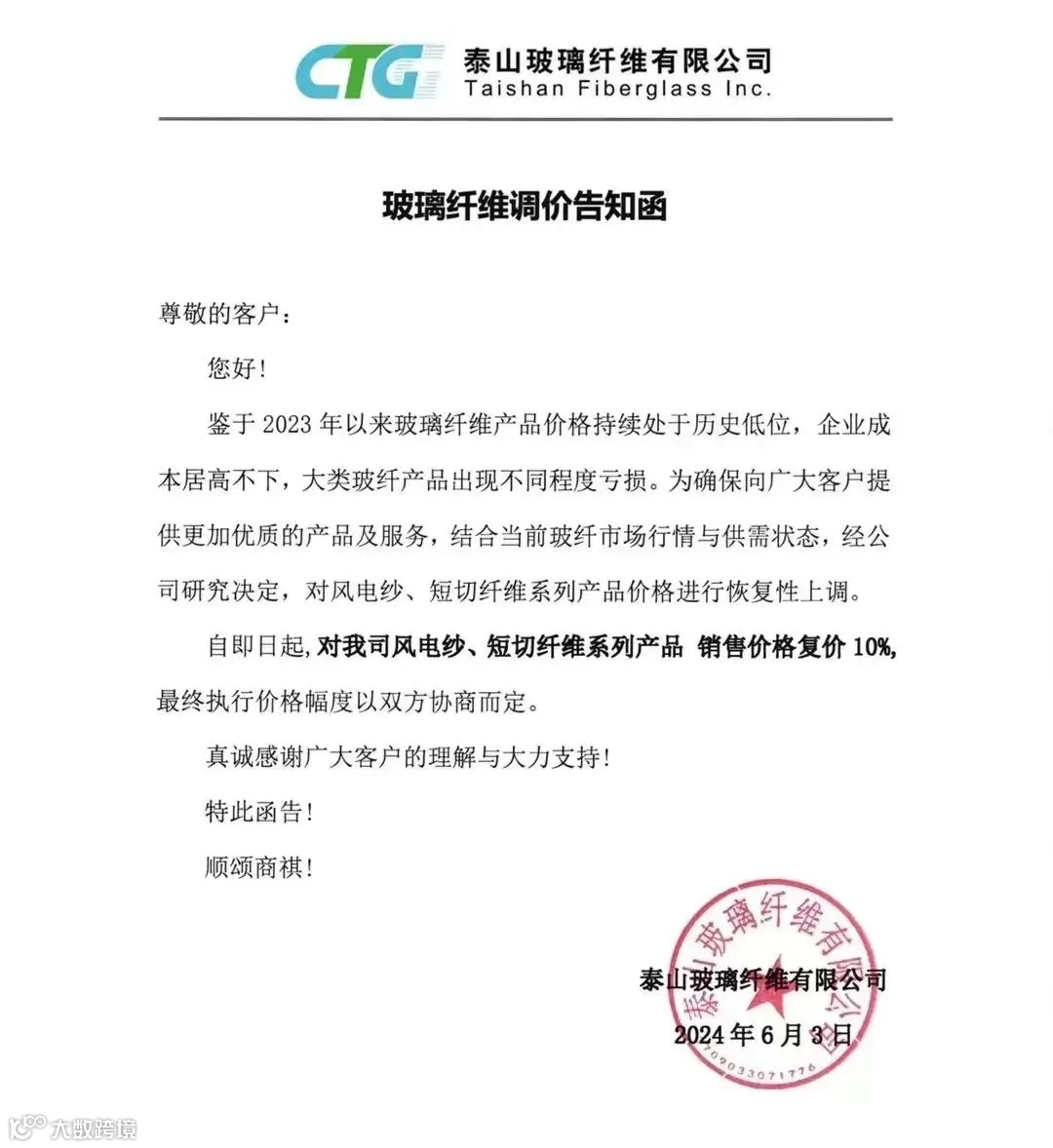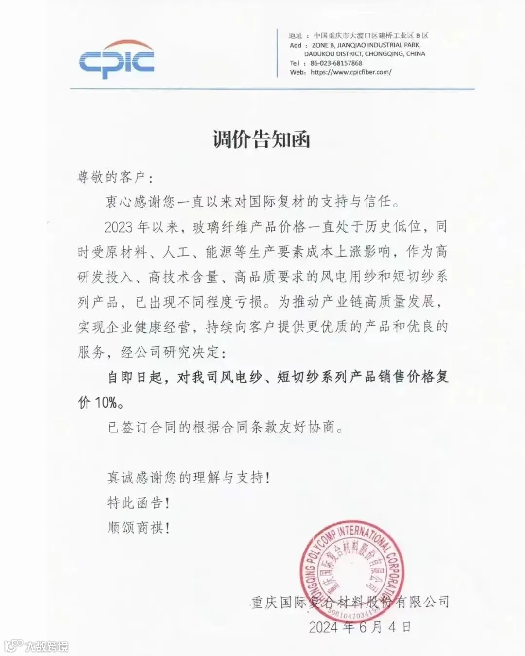 6月4日国际复材发布调价告知函:即日起,对风电纱、短切纱系列产品销售价格复价10%。