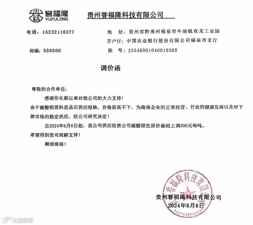贵州誉福隆科技:6月6日起,碳酸钡在原价基础上调300元/吨。