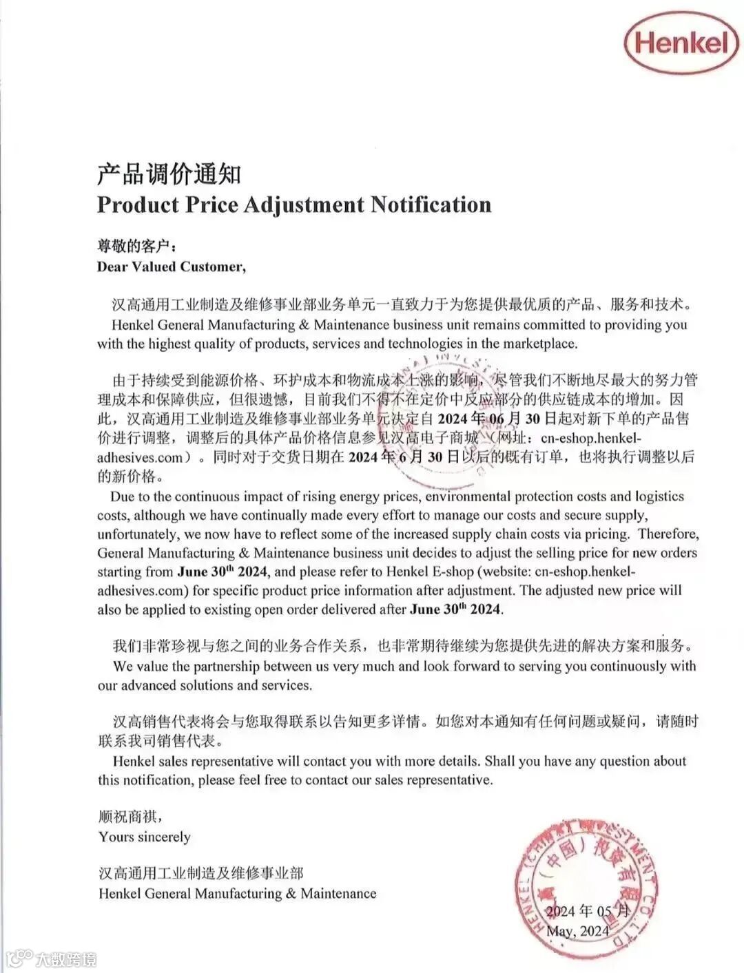 汉高:通用工业制造及维修事业部业务单位将从6月30日起对产品售价上调。