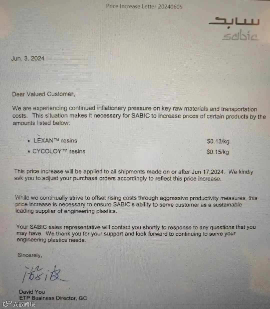 SABIC:LEXAN™(PC)树脂上涨0.13美元/千克,CYCOLOY™(ABS)树脂上涨0.15美元/千克。