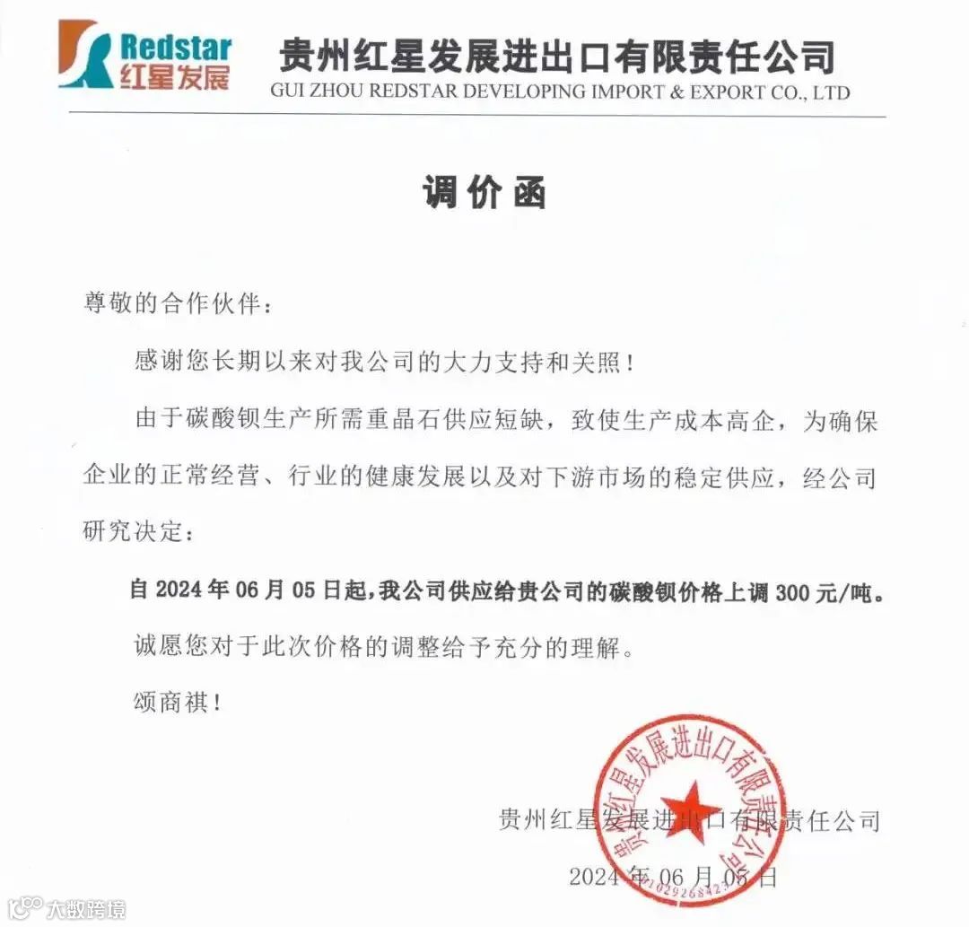 贵州红星发展进出口:6月5日起,碳酸钡价格上调300元/吨。