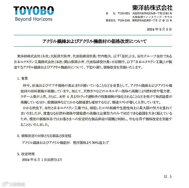 东洋纺株式会社:对生产的丙烯酸纤维和丙烯酸功能材料在当前的价格基础上提涨30%。