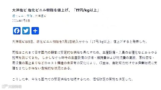 PS株式会社:7月1日发货开始时对旗下所有等级的PS产品进行涨价,每公斤提价19日元以上。