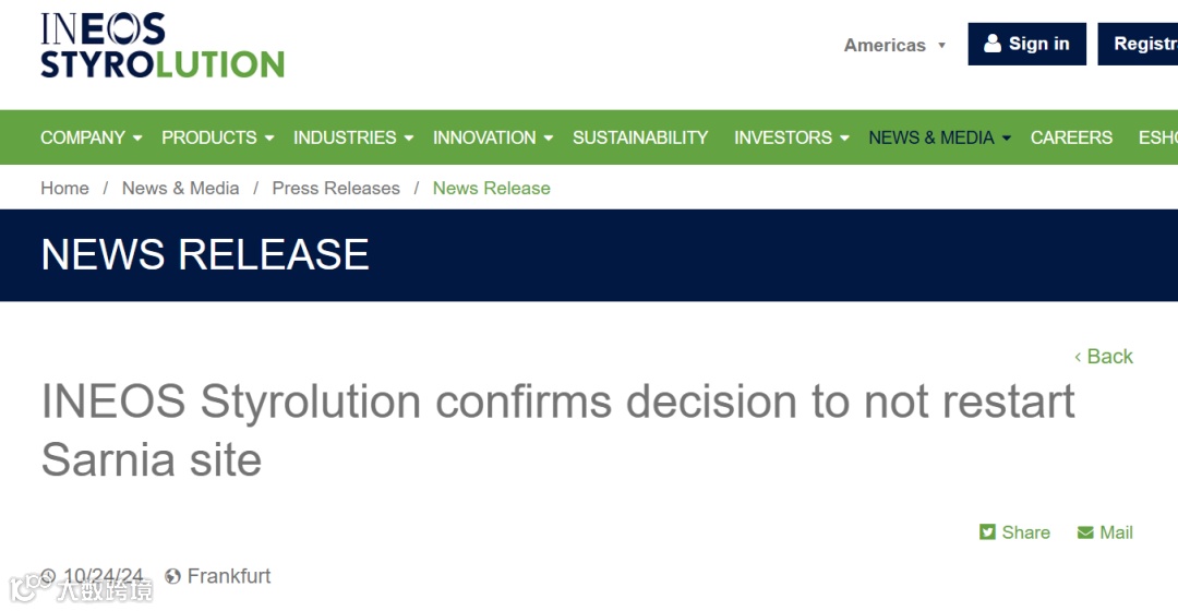 2024年10月24日,英力士苯领宣布确认决定不重启该苯乙烯工厂,预计在2025年第四季度初完成关停。