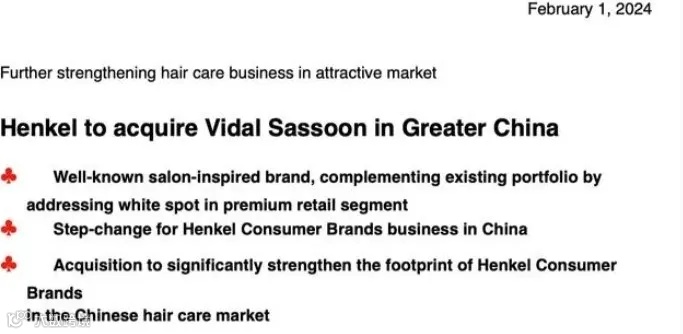 今年2月,汉高宣布已与宝洁集团签署协议,将收购沙宣品牌及大中华区相关头发护理业务,作为其目标性增长战略框架的重要部分。
