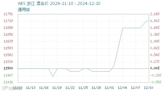 12月起,ABS涨势也极为为明显,市场行情有所回暖,价格普遍小幅走高,如今价格从月初11490元/吨涨至11720元/吨,大涨230元/吨。