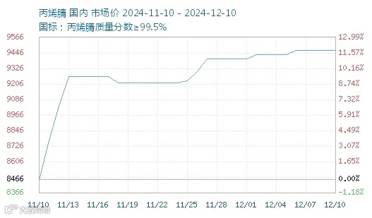 10月中旬至今,丙烯腈开启上涨走势。从10月17日的8500元/吨,快速拉升到目前的9750元/吨,期间涨幅高达1250元/吨!丙烯腈部分区域货源供应较为紧张,厂家报盘持续调涨,带动市场价格高位走挺。