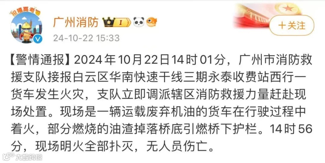 广州化工城最新消息今日(10月22日)14时01分,广州华南快速路段有货车突发火灾。