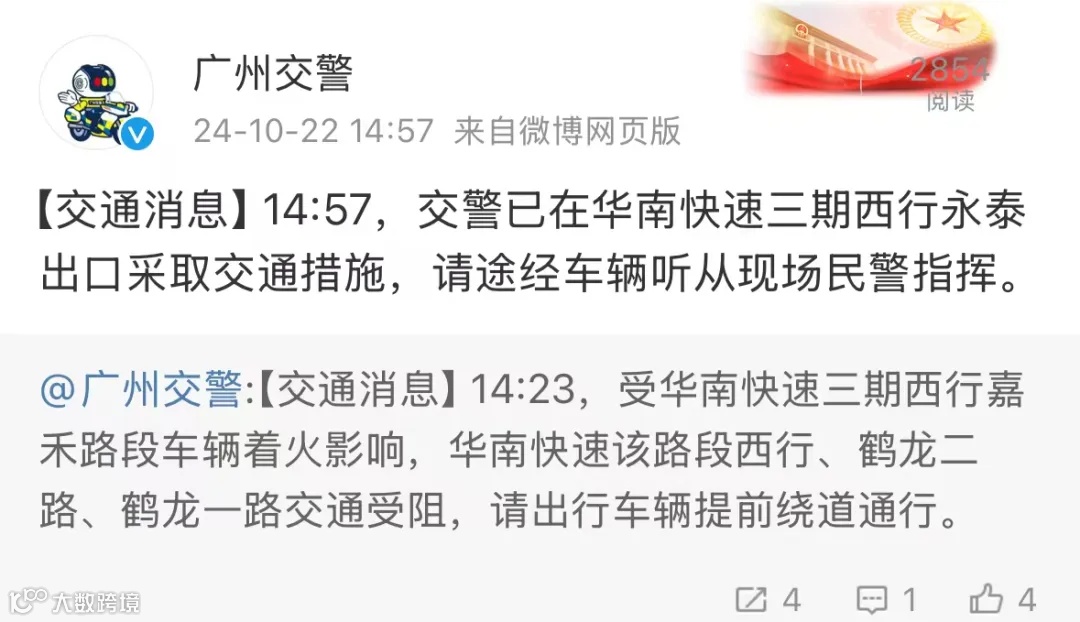 据@广州交警消息,14点23分,受华南快速三期西行嘉禾路段车辆着火影响,华南快速该路段西行、鹤龙二路、鹤龙一路交通受阻,请出行车辆提前绕道通行。