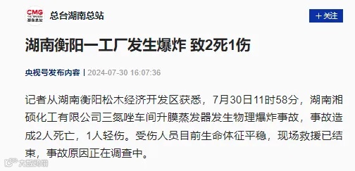 据悉,此前一个月,7月30日,同样在湖南衡阳松木经开区,湖南湘硕化工有限公司三氮唑车间升膜蒸发器发生物理爆炸事故,事故造成2人死亡,1人轻伤。受伤人员目前生命体征平稳,现场救援已结束,事故原因正在调查中。