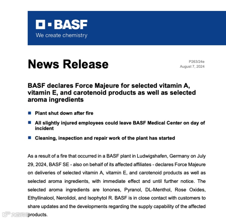 基地一装置的火灾影响,巴斯夫欧洲公司部分维生素A、维生素E、类胡萝卜素产品以及部分香原料产品的供应遭遇不可抗力影响。