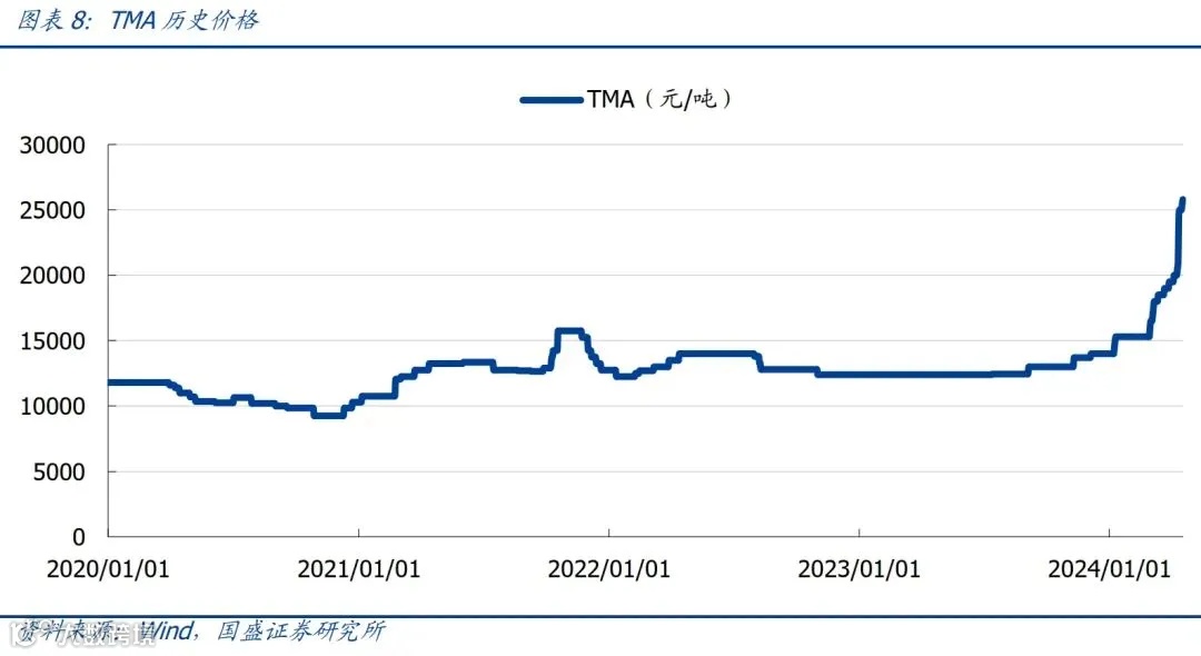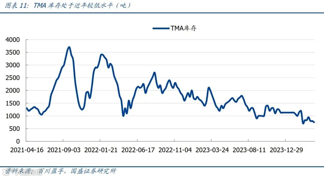 目前,TMA全球总产能约25万吨,主要有5家生产企业,其中美国英力士7万吨,意大利波林3万吨,正丹股份8.5万吨,百川股份4万吨,泰达新材3万吨,属于垄断性格局。消息称“行业第二”的美国英力士装置宣布结束TMA生产,相关生产设备已拆除,意味着全球供应将出现明显缺口。另外,国内工厂部分装置停车或低负荷运行,导致TMA现货流动整体偏紧。