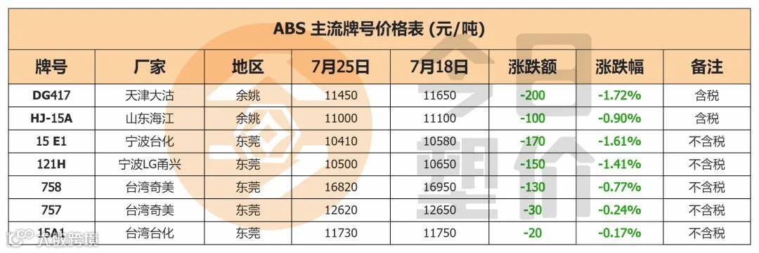 下游市场需求不振,这股寒气也传导到上游塑料市场,7月一度扛起塑市反弹重任的ABS也在下旬偃旗息鼓,遭遇明显回调,市场主流牌号如大沽417,台湾奇美757、758等纷纷飘绿!今天就来扒一扒到底是什么原因导致ABS“调转船头”!