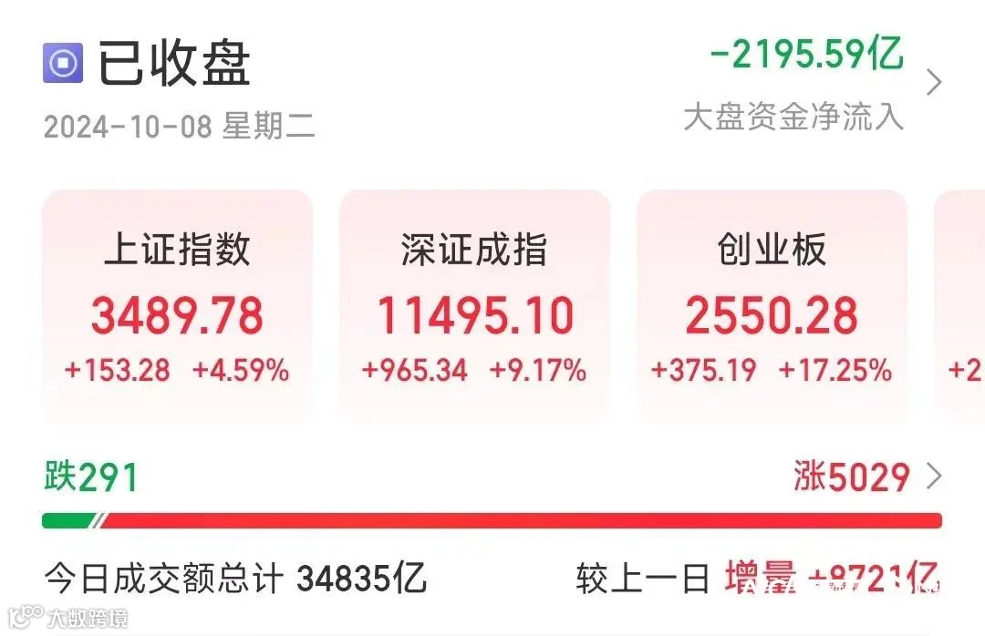 截至今天(10月8日)收盘,上证指数报3489.78点,涨4.59%,深证成指报11495.10点,涨9.17%,创业板指报2550.28点,涨17.25%。沪深京三市成交额34835亿元,较上日放量8721亿元,这也是沪深京三市成交额历史首次突破3万亿元。三市超5000只个股上涨。