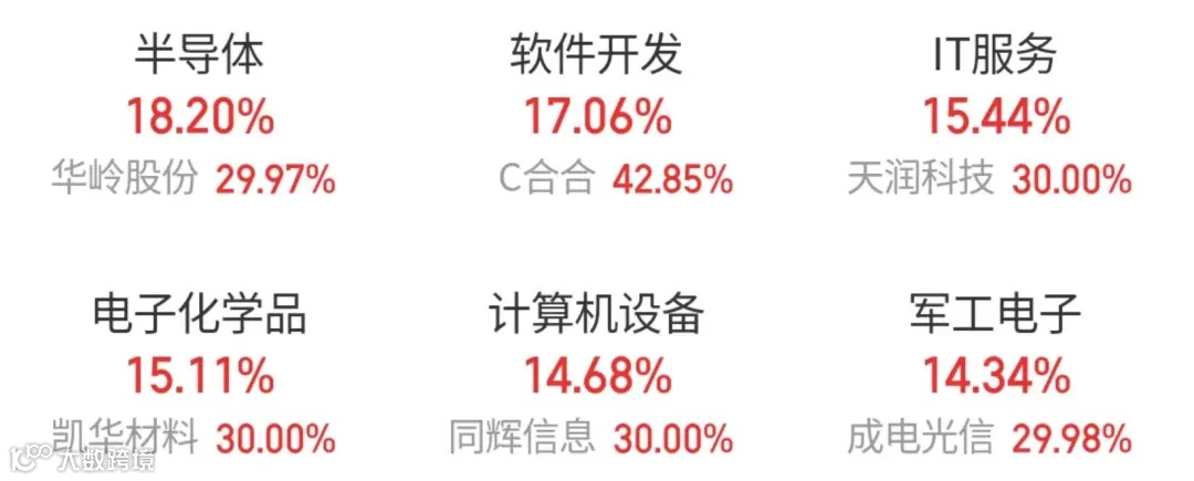 从板块来看,半导体、软件开发、IT服务、电子化学品等板块领涨,券商股集体涨停,所有板块中仅旅游及酒店飘绿。