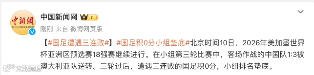 北京时间10日,2026年美加墨世界杯亚洲区预选赛18强赛继续进行。在小组第三轮比赛中,客场作战的中国队1:3被澳大利亚队逆转。三轮过后,遭遇三连败的国足积0分,小组排名垫底。