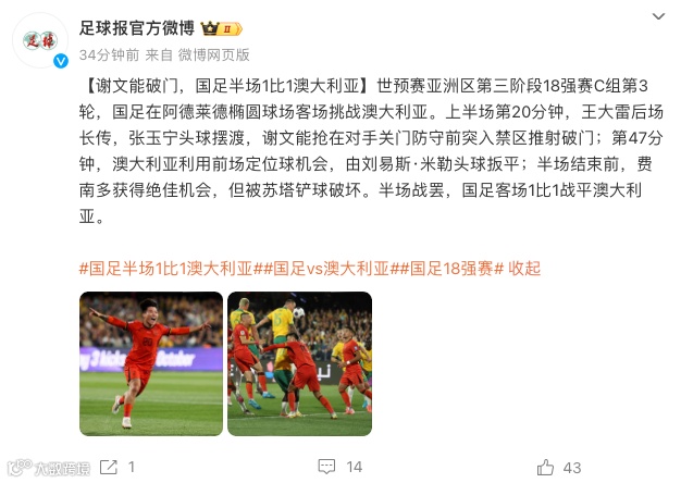 世预赛亚洲区第三阶段18强赛C组第3轮,国足在阿德莱德椭圆球场客场挑战澳大利亚。上半场第20分钟,王大雷后场长传,张玉宁头球摆渡,谢文能抢在对手关门防守前突入禁区推射破门;第47分钟,澳大利亚利用前场定位球机会,由刘易斯·米勒头球扳平;半场结束前,费南多获得绝佳机会,但被苏塔铲球破坏。半场战罢,国足客场1比1战平澳大利亚。