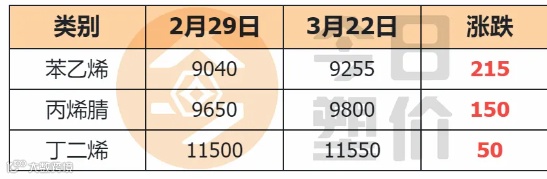 国外提价,国内ABS大厂也不含糊!如上表所示,从3月初至3月中下旬,ABS市场价格呈现上行态势,市场价格整体涨幅在400-700元/吨。上涨的原因主要受到原料丁二烯、苯乙烯带动,厂家目前成本压力较大,迫于成本压力,石化厂家持续上调出厂报价,市场跟涨贸易商逢高出货。