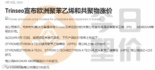 高抗冲聚苯乙烯等级(HIPS)每公吨涨价+235欧元(约合人民币1833元/吨);