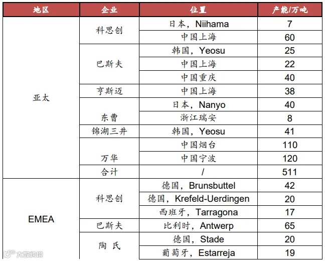 在MDI领域,万华化学现拥有265万吨/年产能,产能分布于三个地区,分别是山东烟台110万吨/年,浙江宁波120万吨/年,匈牙利卡辛克巴契卡市35万吨/年。作为全球最大的MDI生产商,万华化学产能占全球产能近三成,而此次停产检修产能占其总产能的41.5%,占比较大。全球MDI产能分布情况见下表。