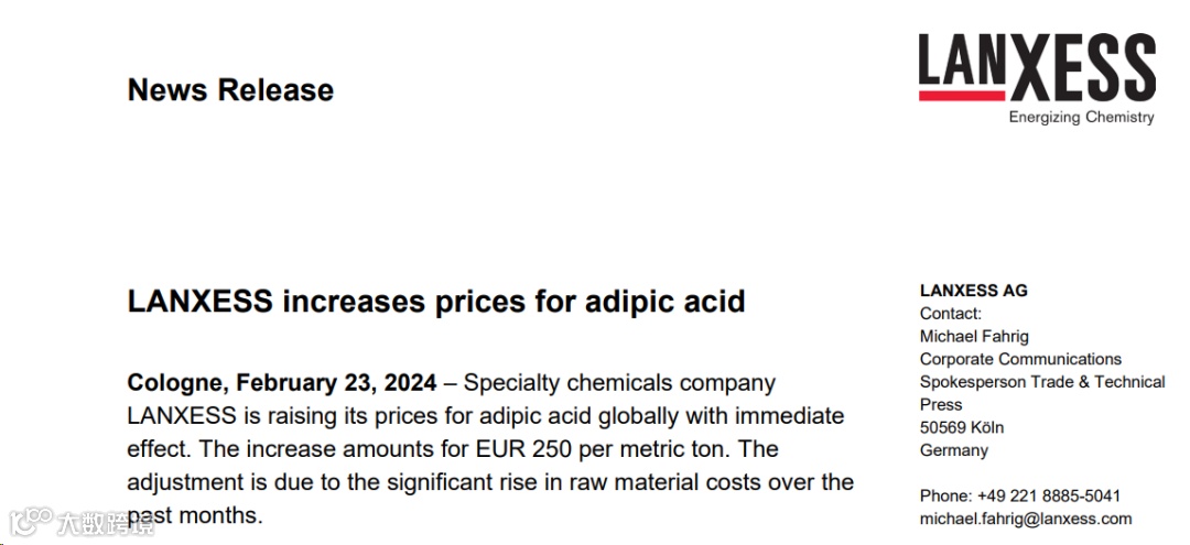 ▶▶朗盛:在全球范围内提高己二酸的价格每公吨250欧元。