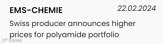 2月22日,另据欧洲塑料网报道,瑞士聚酰胺生产商EMS宣布提高其PA产品组合价格,日前,这家企业发布2023年度财报的同时也宣布继续扩能增员。
