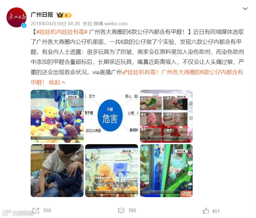 有媒体和监管部门调查发现,娃娃机里毛绒玩具(以下称“娃娃”)的质量令人担忧,部分产品含有一级致癌物甲醛。长期接触低剂量甲醛,有很大的安全隐患。