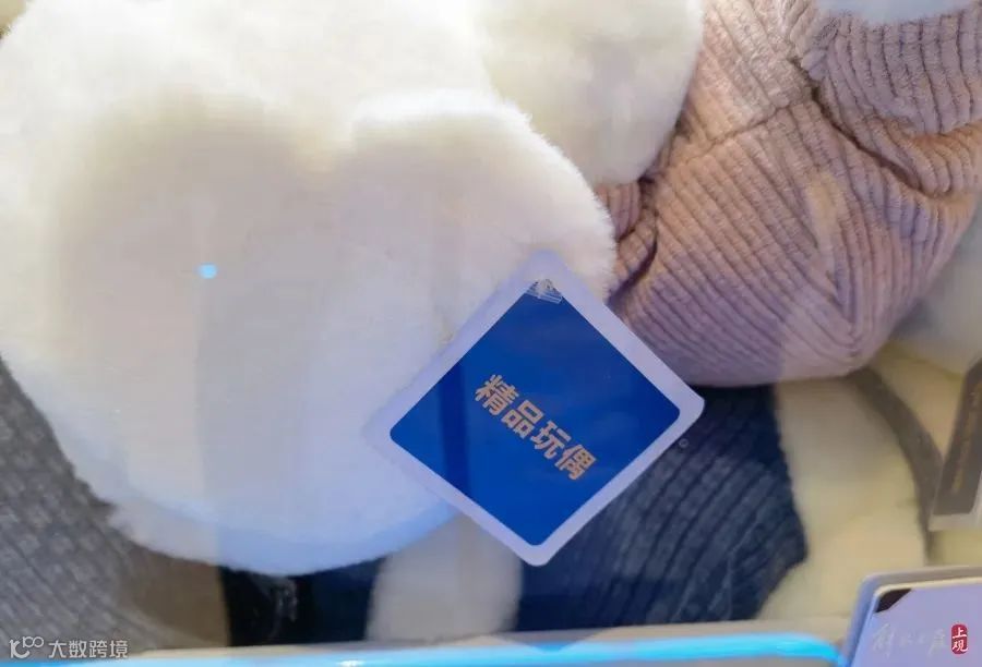另一台里的娃娃挂着“精品玩偶”的标签,但标签背面并没有生产信息,只有安全提示; -
