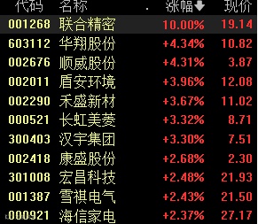 截至2月26日午盘,联合精密涨停,华翔股份、顺威股份4%,盾安环境、禾盛新材、长虹美菱、汉宇集团3%。
