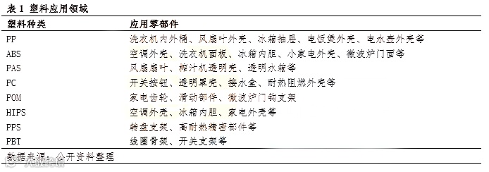 首先就是塑料行业,在家电中,塑料被广泛应用家电的各个零部件,目前许多钢铁材质的家电零配件已经被塑料制品取代。对于其应用的塑料种类来说,家电用塑料大多数为改性塑料,同时家电也是最大的改性塑料消费领域,目前约占改性塑料消费量的35%左右。