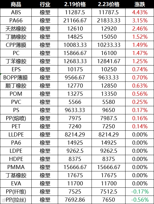 近期,在橡塑板块中,价格环比上升的原料多达15种,涨幅前三分别为ABS(4.43%)、PA66(3.15%)、天然橡胶(2.46%)。在后续政策利好的释放以及年后各大龙头掀起的涨价潮的刺激下,广化君预计市场的需求将进一步复苏,马上就到“金三”了,看来可以期待下旺季的到来了!