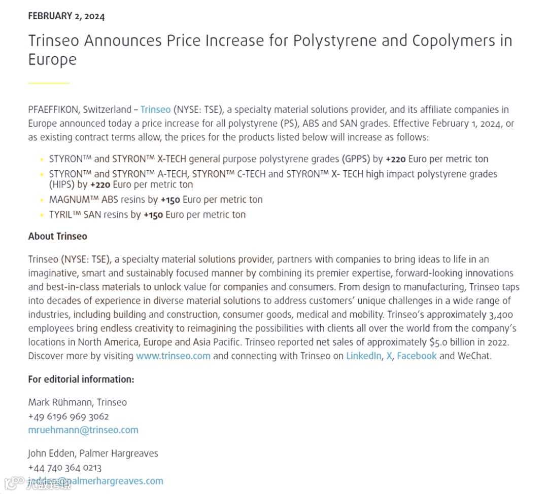 ▶▶林苏(Trinseo)宣布聚乙烯和共聚物涨价