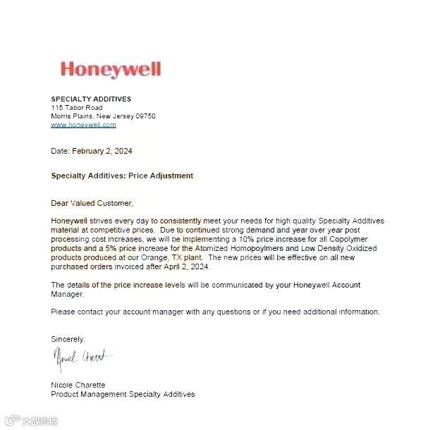 ▶▶霍尼韦尔宣布对特种添加剂材料涨价5%-10%