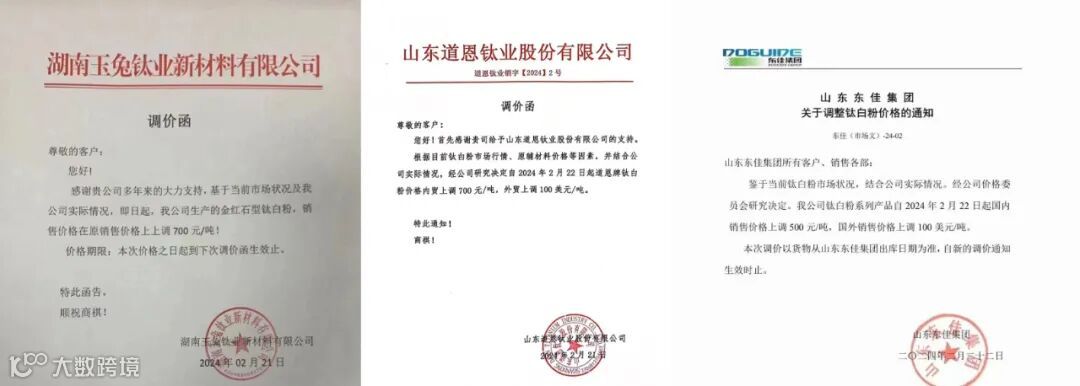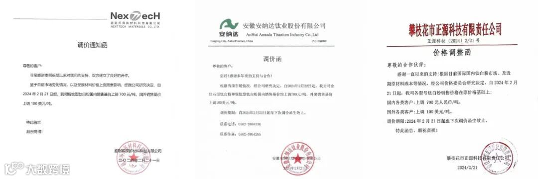 2月20日,钛白粉龙头企业龙佰、惠云发布调价函。之后康诺斯和超彩环保也纷纷上调了钛白粉价格。2月22日,中核、安纳达陆续发布公告宣布涨价。从国外巨头这第一涨价函开始,国内钛白粉企业进入了集体调价阶段这是2024年以来,第二波涨价潮。