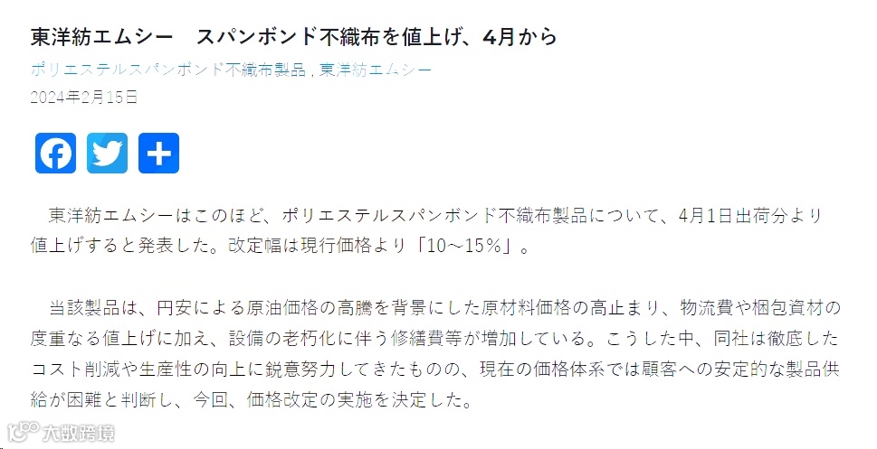 ▶▶东洋纺MC宣布无纺布涨价10%-15%