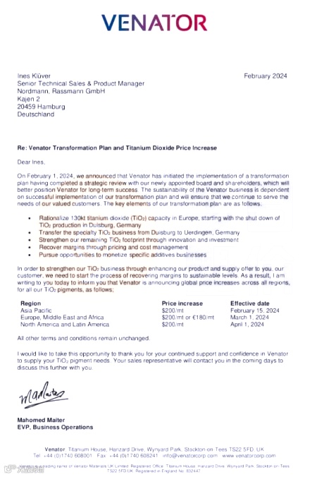除了TDI、MDI价格在上涨,钛白粉也来了一波拉涨。2024年2月15日国际钛白粉巨头泛能拓宣布,因成本上涨,钛白粉价格上涨,每吨上涨200美元。
