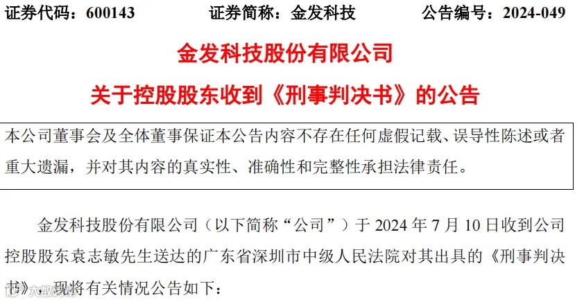 金发科技公告,公司于2024年7月10日收到公司控股股东袁志敏送达的广东省深圳市中级人民法院对其出具的《刑事判决书》。广东省深圳市中级人民法院对本次内幕交易的刑事判决如下:1、被告人袁志敏犯内幕交易罪,判处有期徒刑三年,缓刑四年,并处罚金人民币90万元;2、对被告人袁志敏的违法所得人民币327,294.99元依法予以追缴,上缴国库。