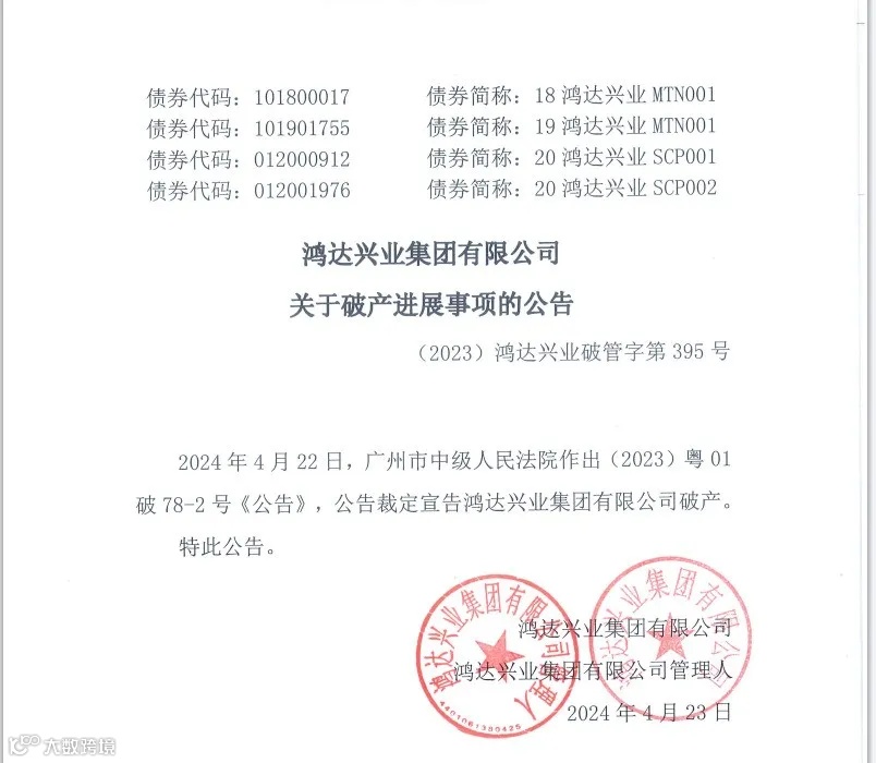 小编注意到,2024年4月22日,全国企业破产重整案件信息网消息显示,广州市中级人民法院作出(2023)粤01破78-2号《公告》。