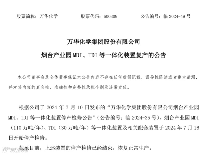 9月9日,万华化学烟台产业园 MDI(110 万吨/年)、TDI(30 万吨/年)等一体化装置及相关配套装置于2024年7月16日开始停产检修。截至目前,上述装置的停产检修已经结束,恢复正常生产。