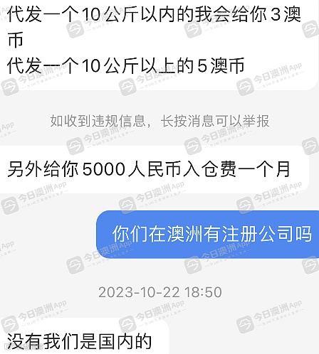 对方自称来自中国一家做工业原材料的工厂,至于价格,“代发一件10公斤以上的5澳币、一个月入仓费5000(元)人民币”。