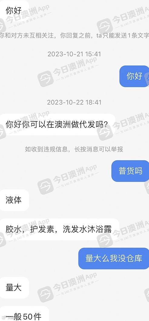 对方询问其是否可在澳洲做代发,产品诸如“胶水、护发素、洗发水、沐浴露”等,“量大、一般50件。”