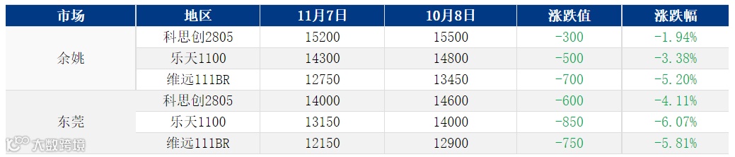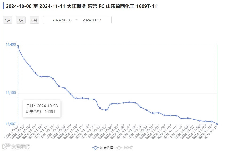 进入10月份,下游整体需求并无改观,工厂维持淡稳采购节奏,后市终端消费环境仍有待改善,下游工厂订单数量或依旧有限,市场库存水平预期或继续上升,以PC/鲁西化工/1609T-11为例,10月8日市场价为14391元/吨,截止至11月11日,价格跌至13907元/吨,下跌484元/吨。
