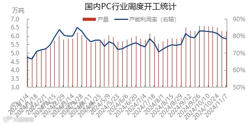 10月份至今,国内共有3套PC装置停车检修,其中,平煤神马及嘉兴帝人均为既定检修,鲁西化工PC装置一条产线临时故障停车,但供应损失量并不多,国庆节后万华化学60万吨/年PC装置负荷满开,极大程度对冲检修损失量,PC单月产量逼近29万吨大关,产能利用率也进一步攀升,国庆节后至今,国内PC行业平均周度产能利用率达到81.29%,虽近两周略有下降,但仍保持在79%左右高位。